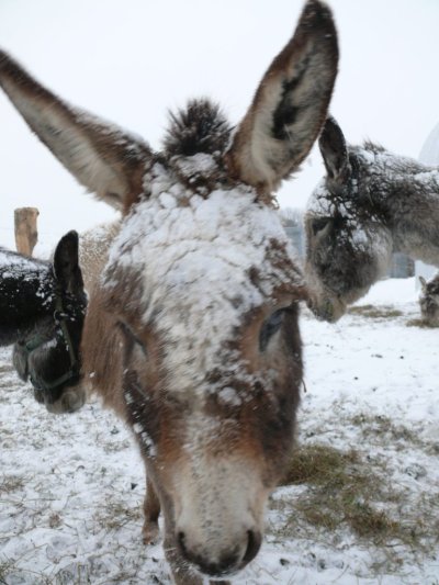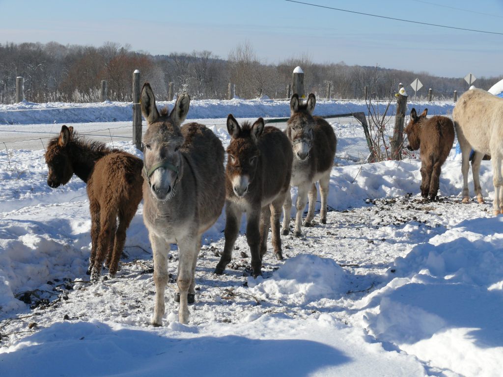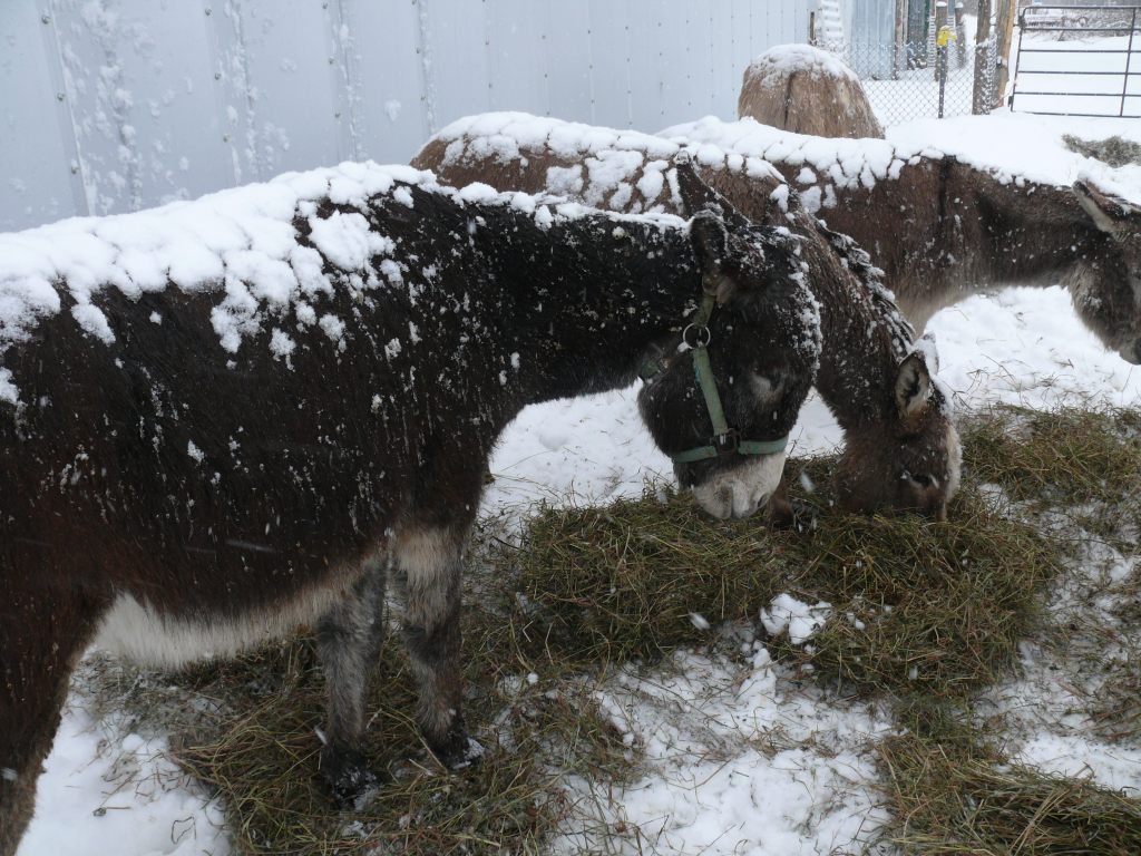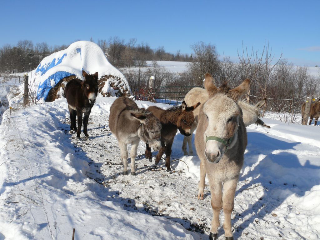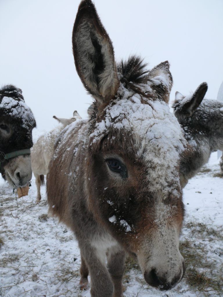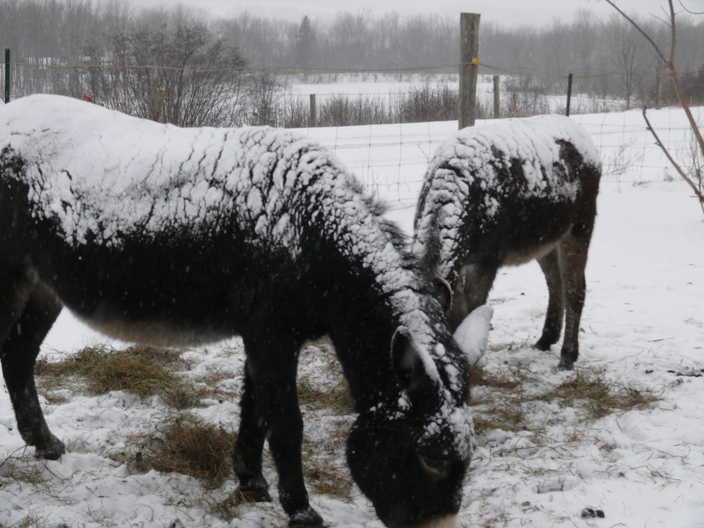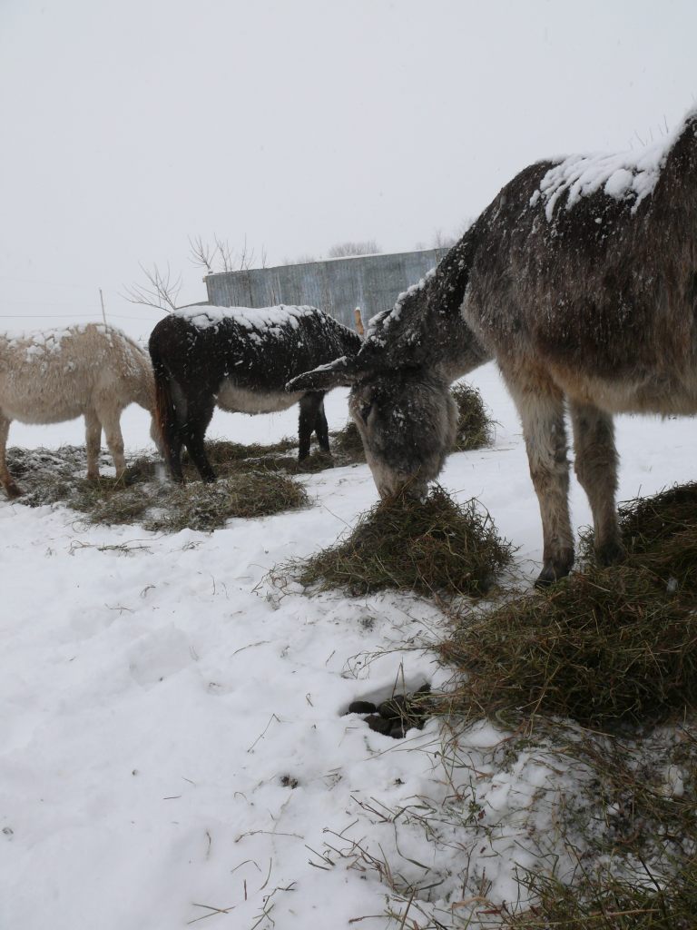 L’hiver, tant qu’il n’y a pas de neige, les ânes restent au pâturage. Ils sont nourris à l’asinerie et se promènent à volonté. Par contre dés qu’il y a de la neige, d’eux même, ils préfèrent rester dans le parc d’hiver. Protégés des vents dominants, ils ont un abri étanche aux intempéries qu’ils n’utilisent qu’en cas de mauvais temps. Ils préfèrent, et de loin, passer leurs journées dehors même par les plus grands froids.