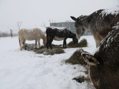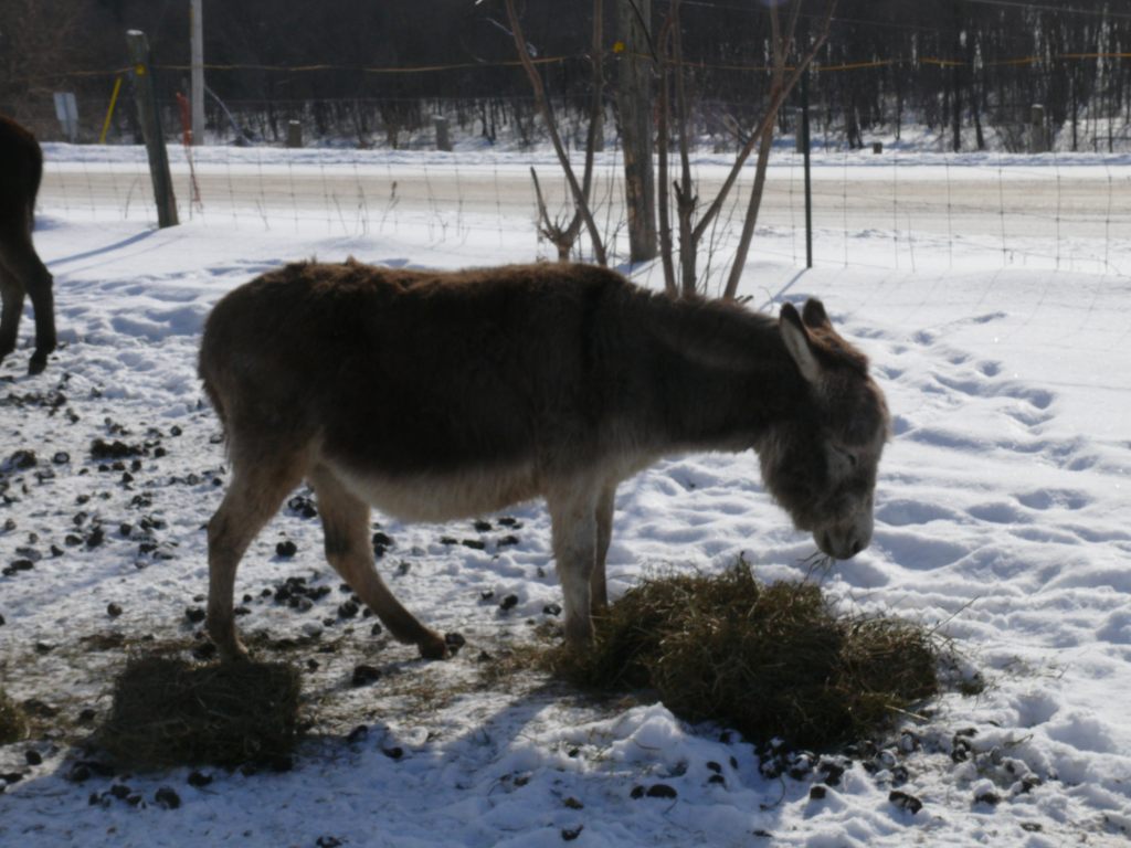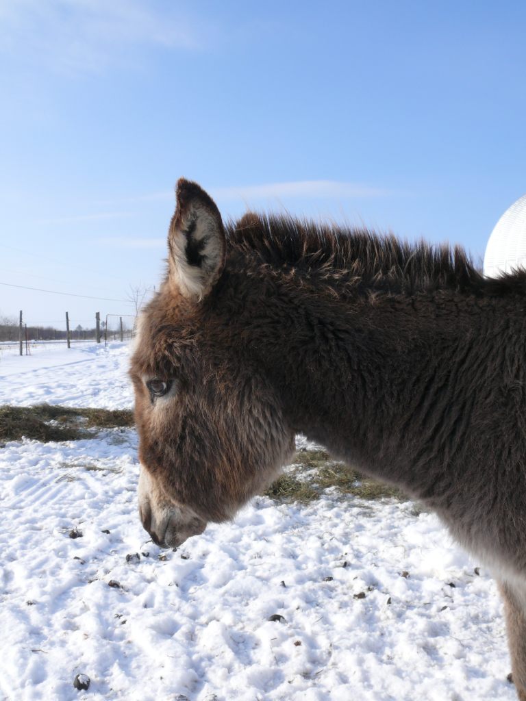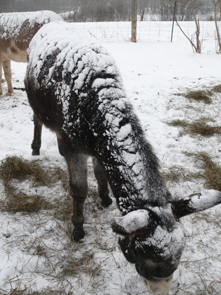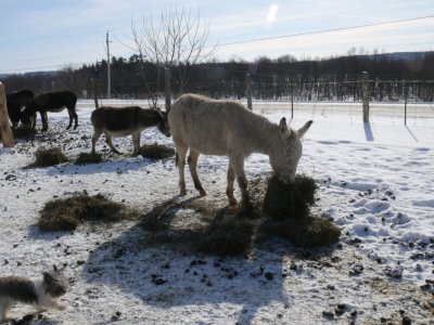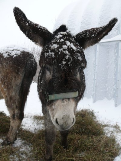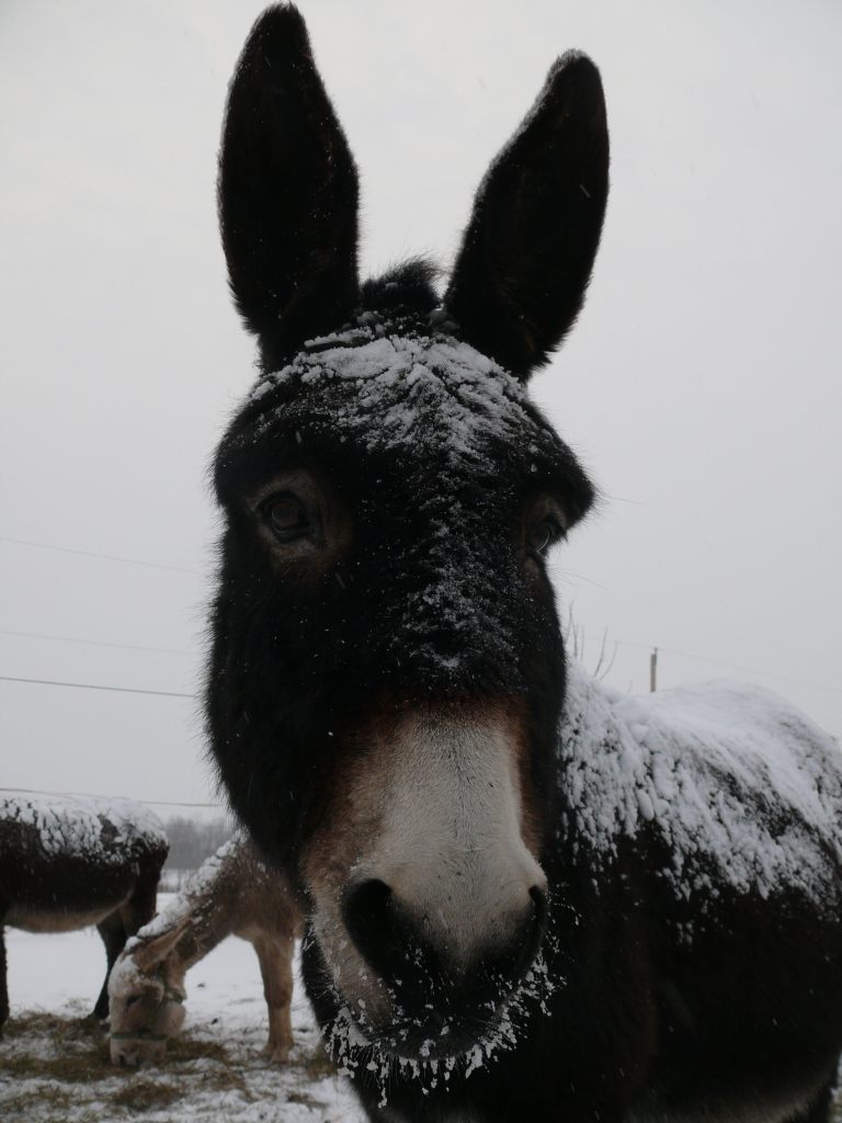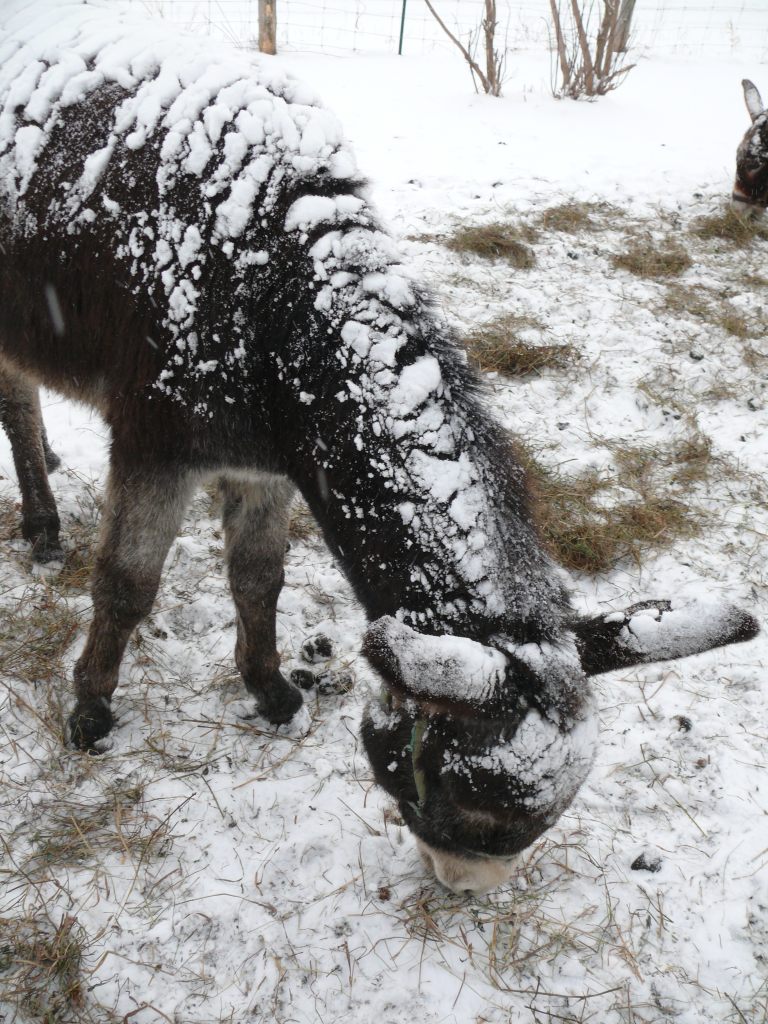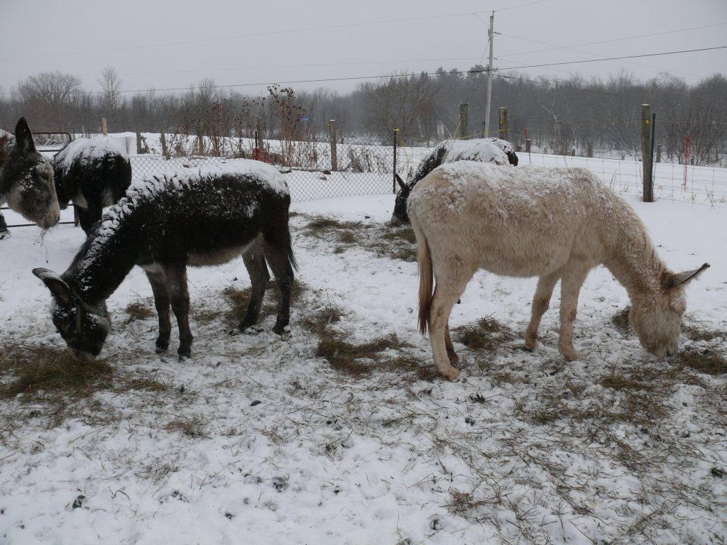 L’hiver, tant qu’il n’y a pas de neige, les ânes restent au pâturage. Ils sont nourris à l’asinerie et se promènent à volonté. Par contre dés qu’il y a de la neige, d’eux même, ils préfèrent rester dans le parc d’hiver. Protégés des vents dominants, ils ont un abri étanche aux intempéries qu’ils n’utilisent qu’en cas de mauvais temps. Ils préfèrent, et de loin, passer leurs journées dehors même par les plus grands froids.
