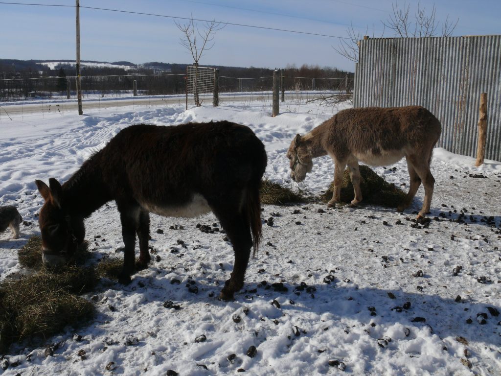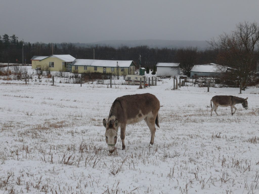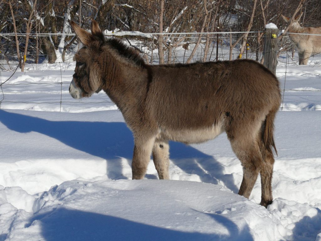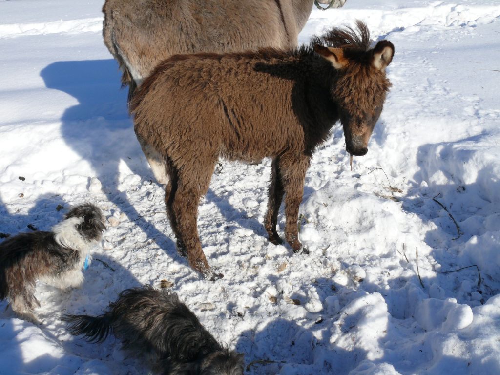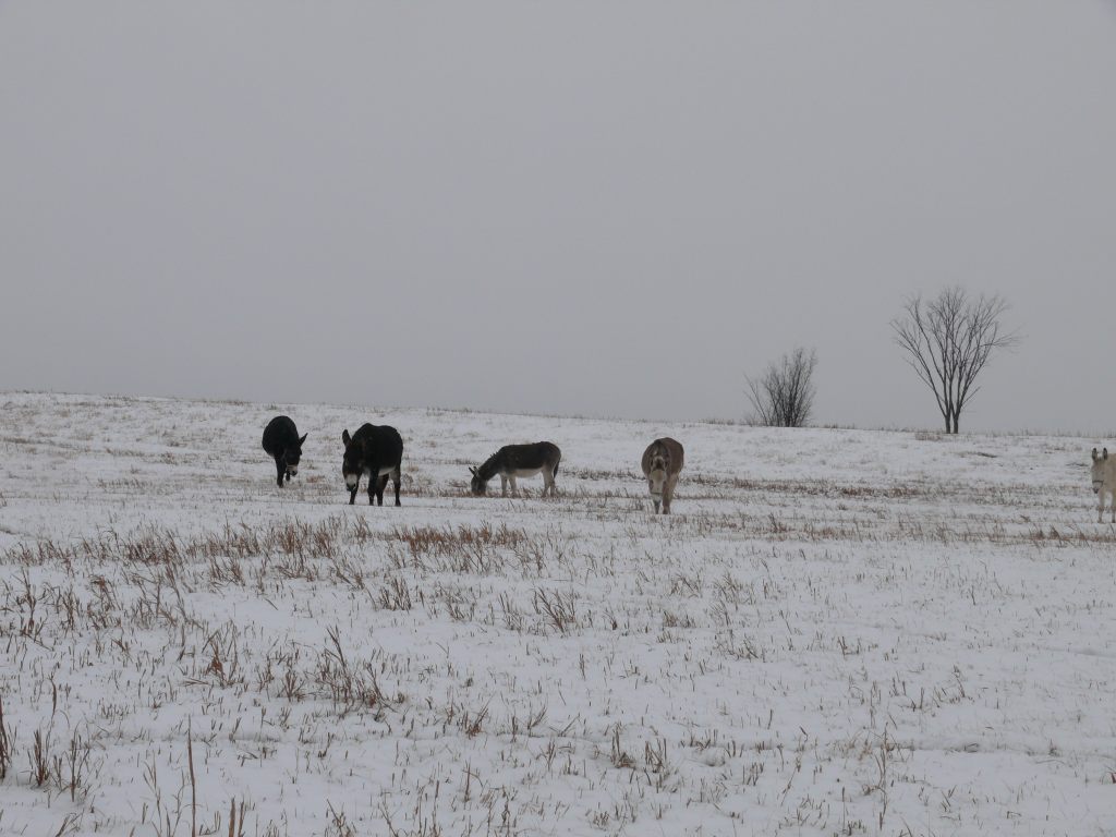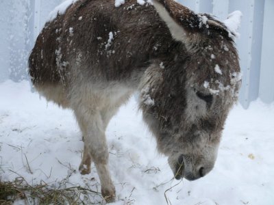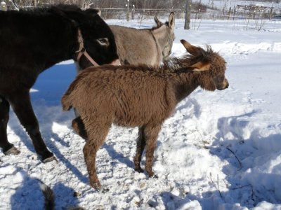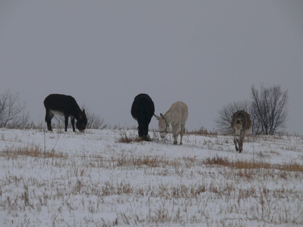 L’hiver, tant qu’il n’y a pas de neige, les ânes restent au pâturage. Ils sont nourris à l’asinerie et se promènent à volonté. Par contre dés qu’il y a de la neige, d’eux même, ils préfèrent rester dans le parc d’hiver. Protégés des vents dominants, ils ont un abri étanche aux intempéries qu’ils n’utilisent qu’en cas de mauvais temps. Ils préfèrent, et de loin, passer leurs journées dehors même par les plus grands froids.