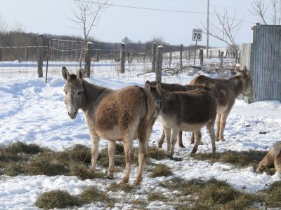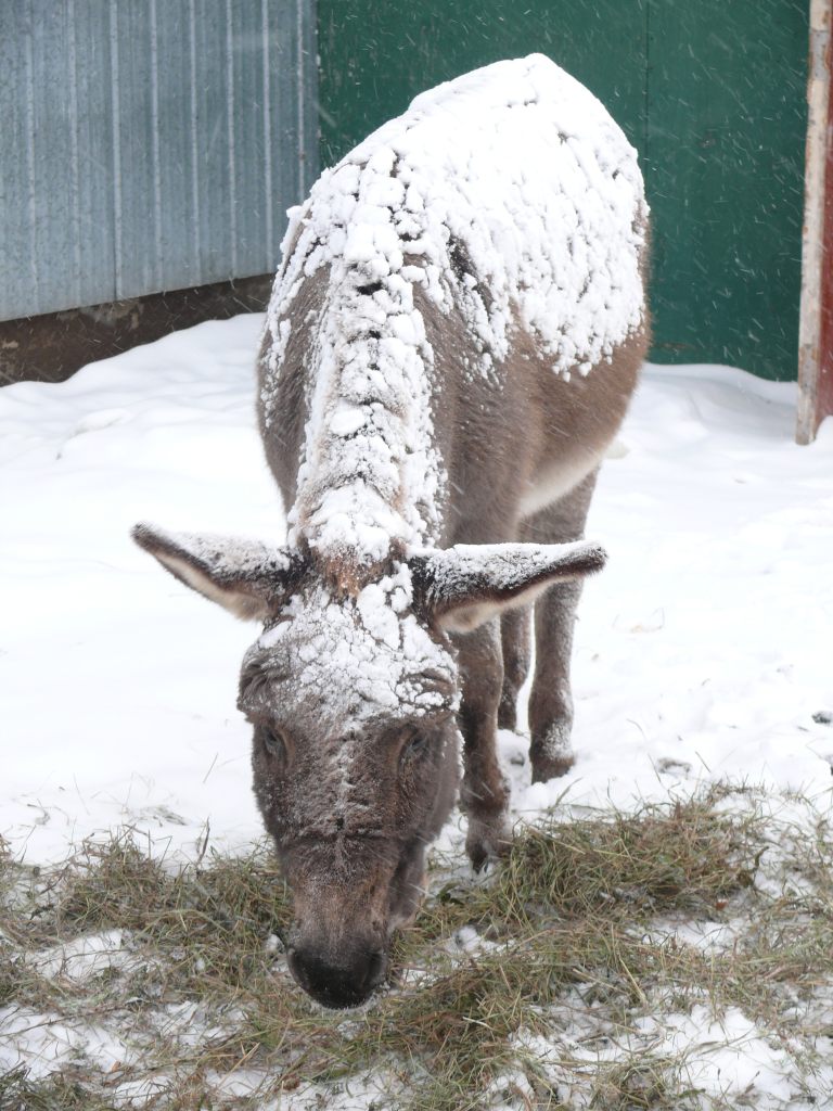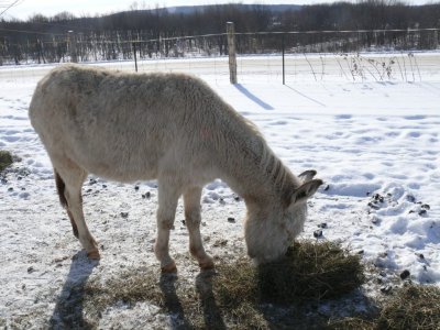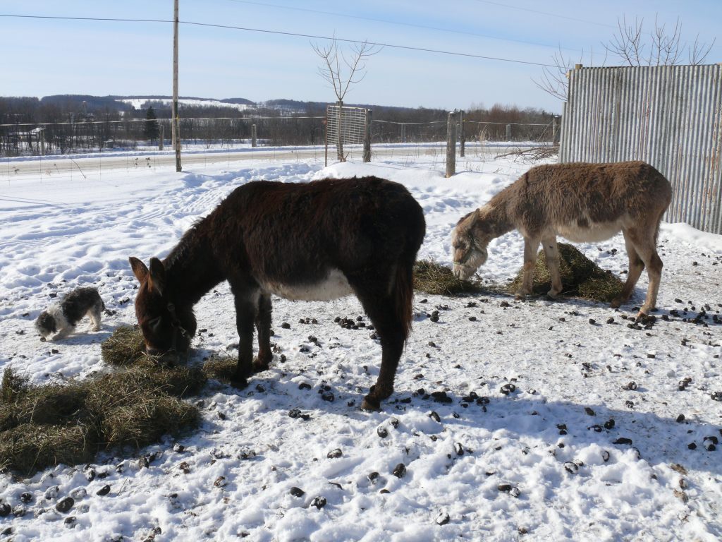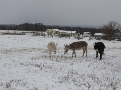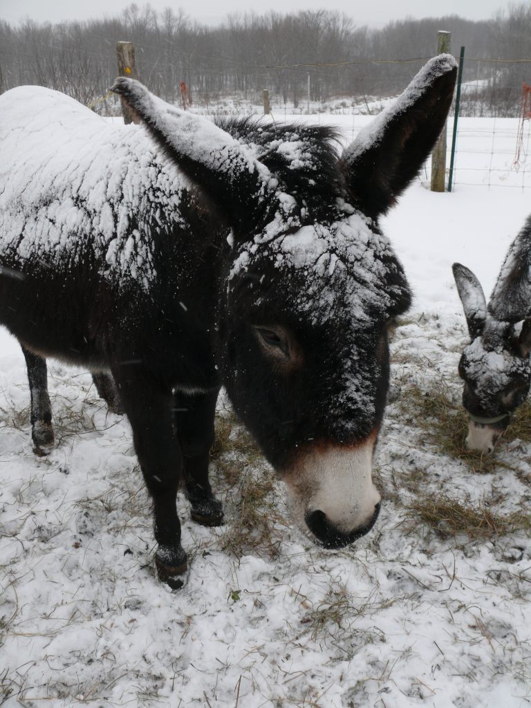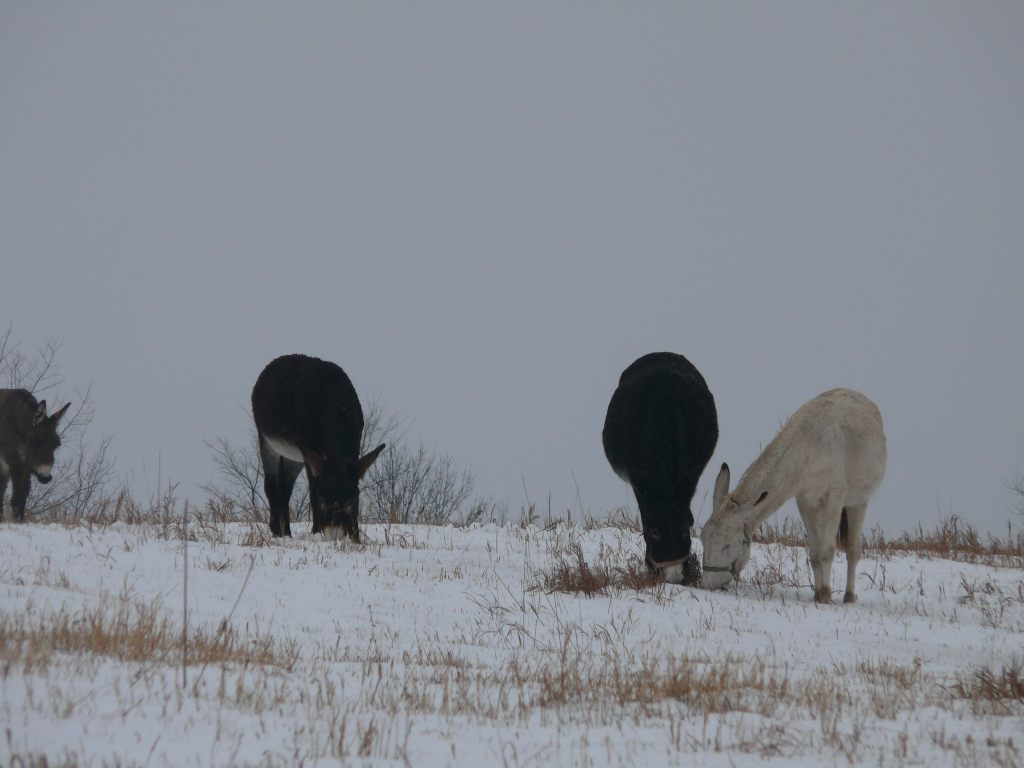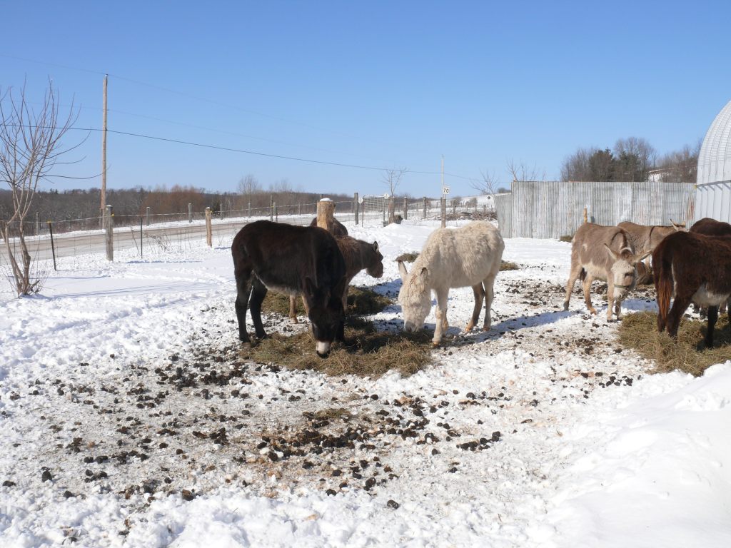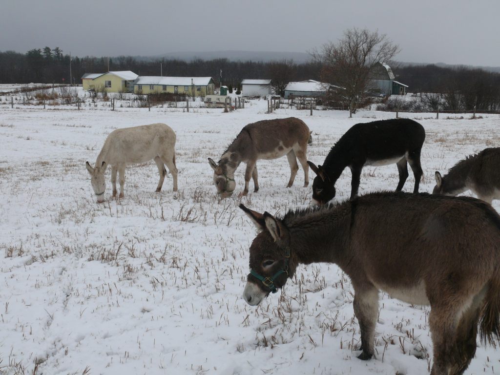 L’hiver, tant qu’il n’y a pas de neige, les ânes restent au pâturage. Ils sont nourris à l’asinerie et se promènent à volonté. Par contre dés qu’il y a de la neige, d’eux même, ils préfèrent rester dans le parc d’hiver. Protégés des vents dominants, ils ont un abri étanche aux intempéries qu’ils n’utilisent qu’en cas de mauvais temps. Ils préfèrent, et de loin, passer leurs journées dehors même par les plus grands froids.