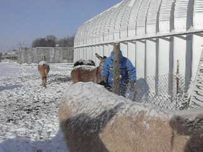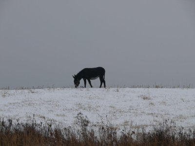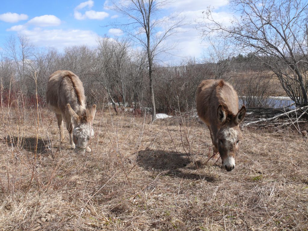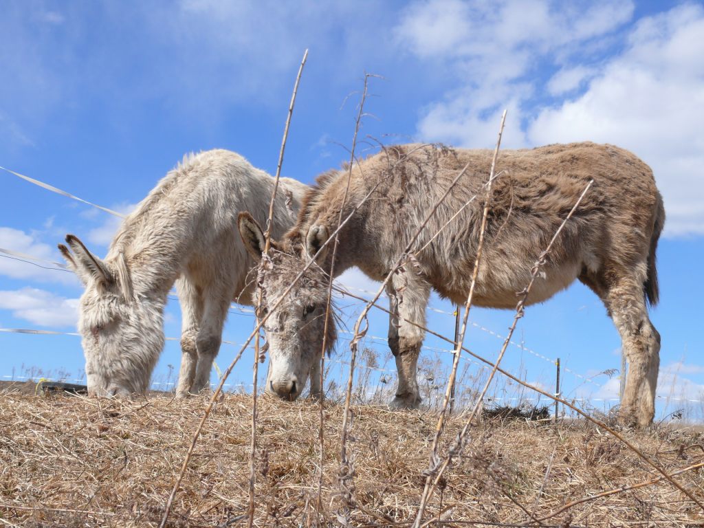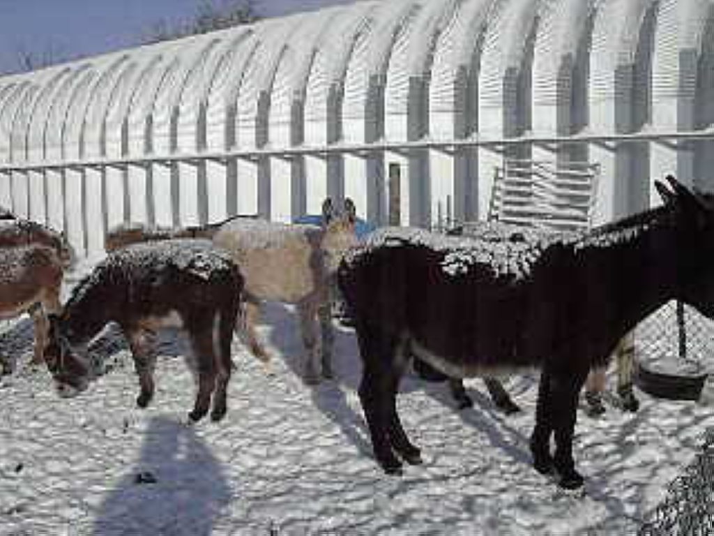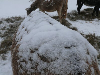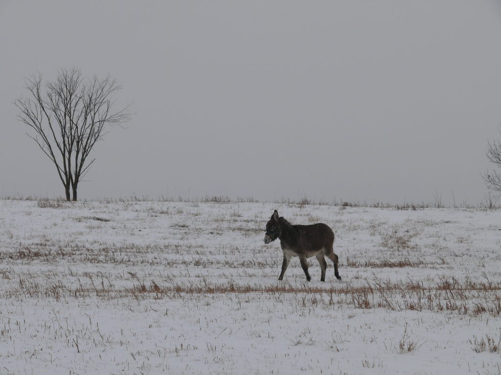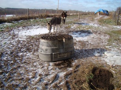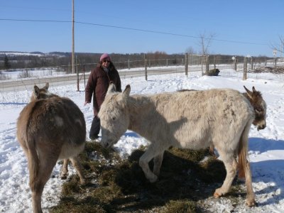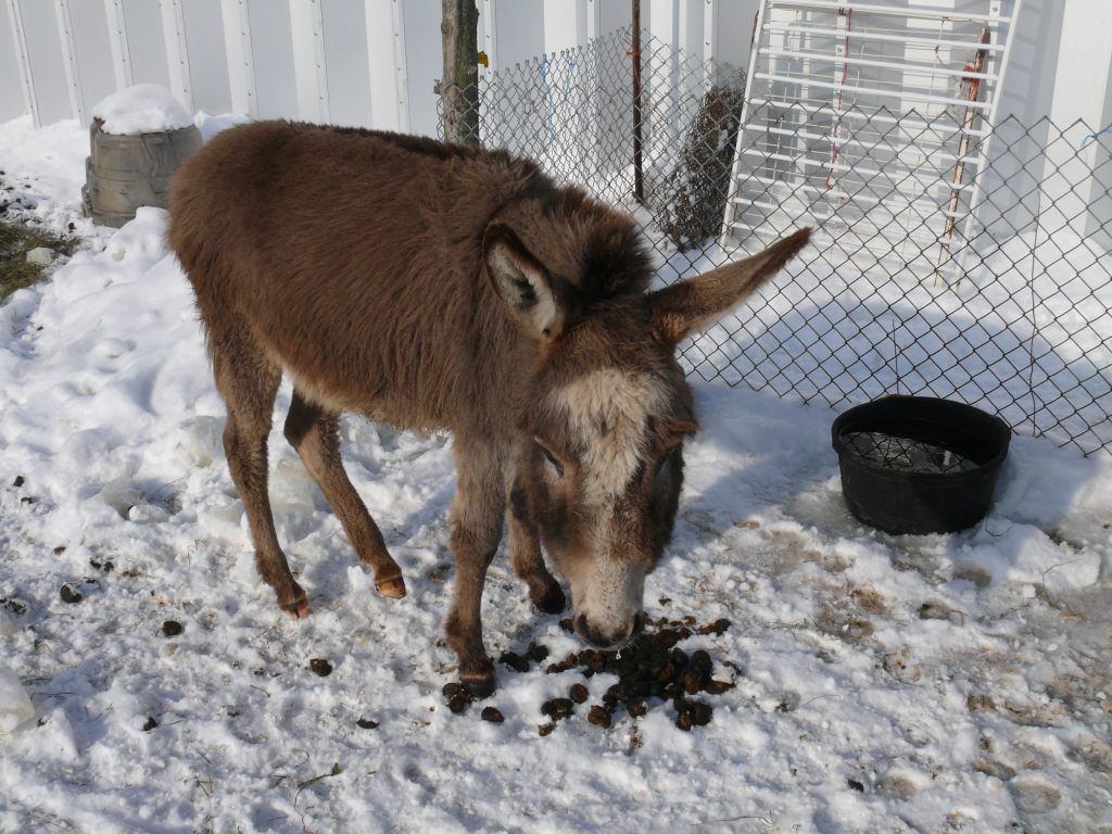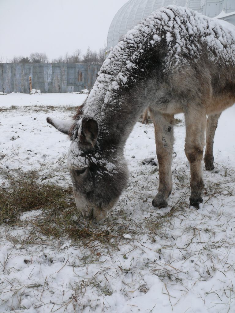 L’hiver, tant qu’il n’y a pas de neige, les ânes restent au pâturage. Ils sont nourris à l’asinerie et se promènent à volonté. Par contre dés qu’il y a de la neige, d’eux même, ils préfèrent rester dans le parc d’hiver. Protégés des vents dominants, ils ont un abri étanche aux intempéries qu’ils n’utilisent qu’en cas de mauvais temps. Ils préfèrent, et de loin, passer leurs journées dehors même par les plus grands froids.