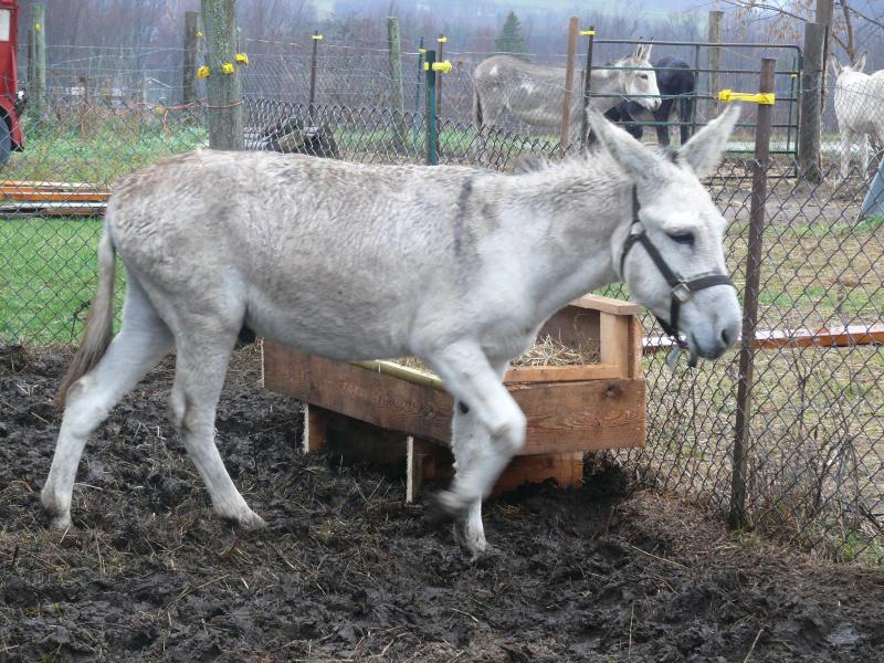 Lors de la grande tempête de fin d’année, Jericho qui semblait s’affaiblir de jour en jour, est retrouvé couché. Il est allongé au sol, il est moitié gelé, ne tient plus debout... Je soupçonne le mouton de ne pas être étranger au mal étrange de Jericho. C’est un bélier, sans cornes, mignon, adorable mais qui de temps en temps a mauvais caractère et est batailleur. On suspend Jéricho à des sangles pour l’obliger à rester de bout, on vire le mouton. Le nourrir de grain est délicat, car avec lui les fourbures sont rapides. En plus du foin, je décide de lui donner un mélange de grains orge 20 % et maïs 80 %. Au bout d’une semaine, il a repris de la force et semble bien aller.