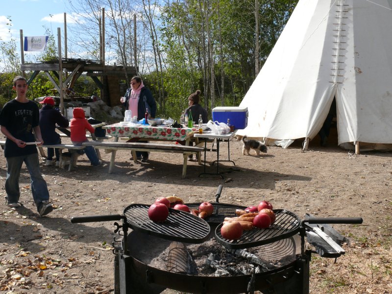 Un repas communautaire était prévu à midi avec BBQ, chacun a amené de bonnes choses et nous avons mis les victuailles en commun. Nous avons dégusté des saucisses de porc, sanglier, orignal, bu de l’hydromel, du cidre, du vin blanc...