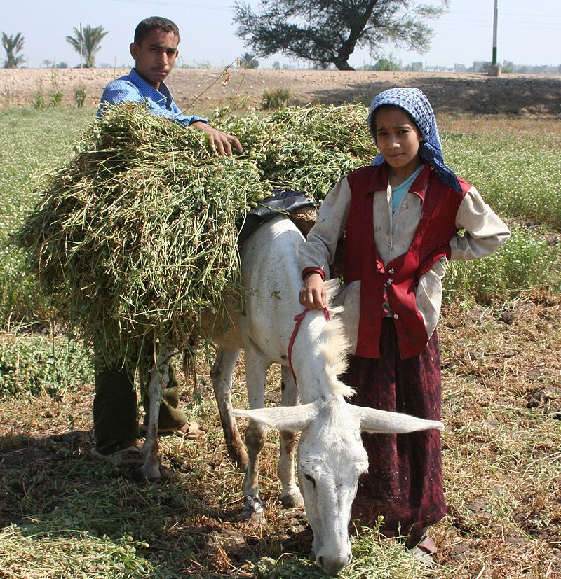 Âne blanc d’Égypte utilisé pour des travaux agricoles.