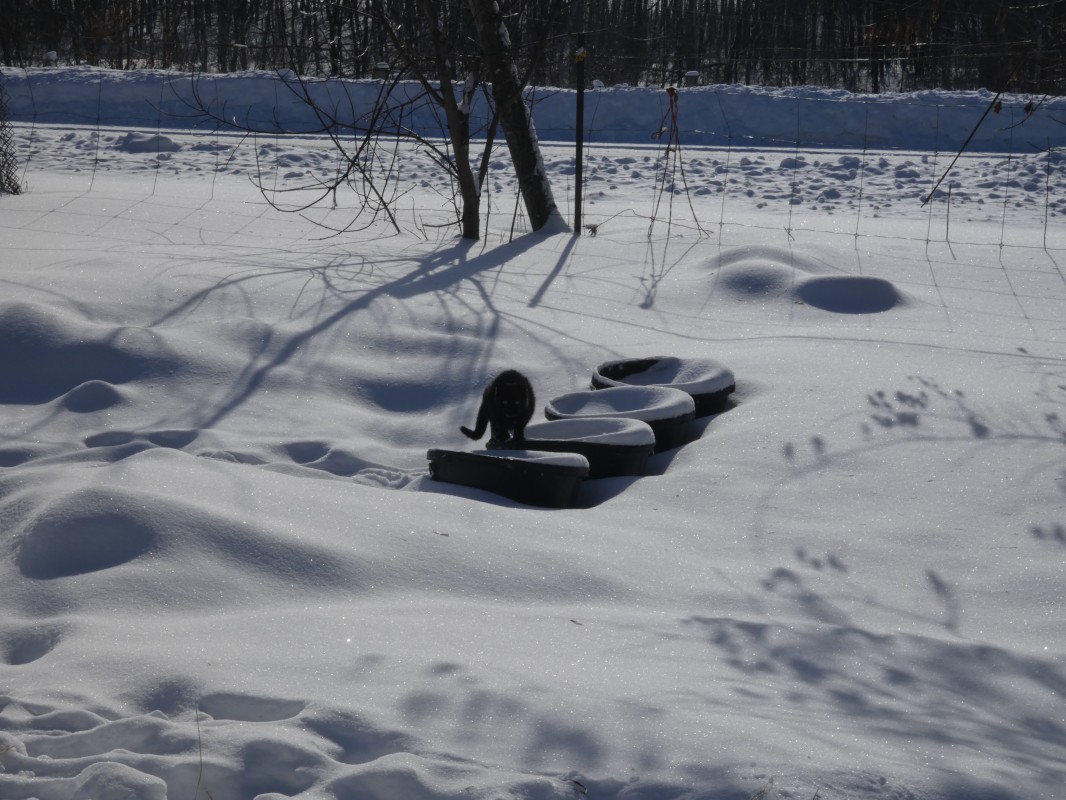 En fin d’après midi, je donne une balle carrée de paille et je remplis à nouveau les seaux. C’est généralement, le moment ou ils boivent le plus. Je donne ce qu’il faut pas plus, afin que les bacs ne gèlent pas plein. C est toujours pénible de devoir sortir 20 kg de glace collée dans un bac…