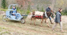 Randoline, un véhicule tracté par un petit âne qui autorise la promenade et la randonnée en pleine nature aux personnes à mobilité réduite.
