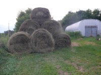 J’ai eu plus de moitié moins de dons qu’une année ordinaire et mes revenus sont bas. Il m’était donc impossible d’acheter des balles carrées, trop chères pour mon budget. En plus mes wwoofeurs ayant annulé leur séjour (3 de suites, le wwoofing n’est plus ce que c’était…), ranger 500 balles carrées était pour moi problématique, ayant eu un accident au dos qui m’handicape beaucoup et m’empêche de lever des charges… alors porter et lever à bout de bras des balles de plus de 20 kg, pour mois cette année c’est impossible.