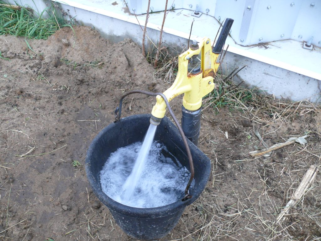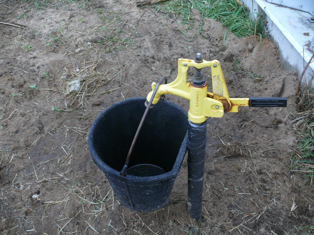 Son fonctionnement est simple. Le robinet est à 6 pieds de profondeur, la poignée sur le col de cygne du robinet. Quand on l’ouvre, l’eau monte remplit les seaux, l’abreuvoir...