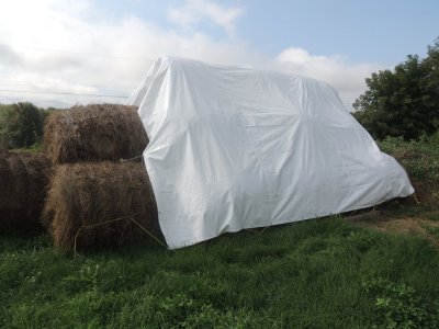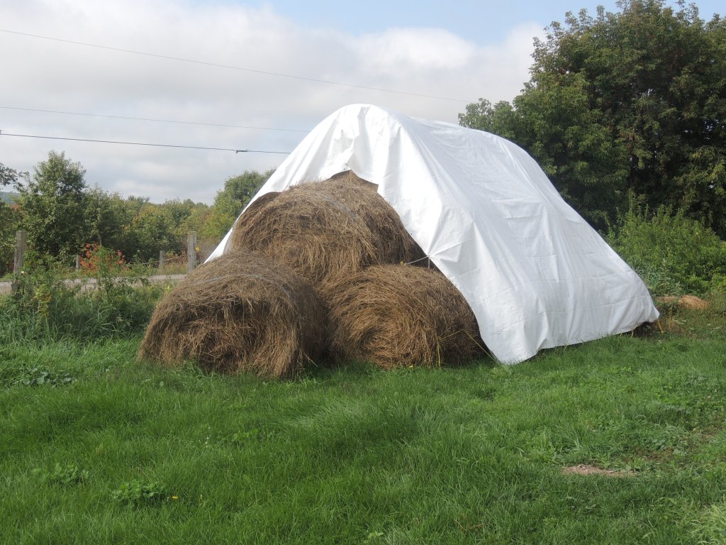 J’ai donc commandé une bâche robuste pour protéger mon foin de la pluie et de la neige.