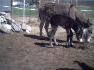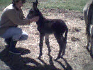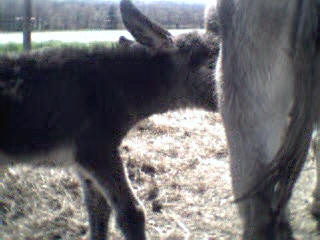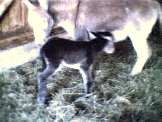 Le 11 mai 2002, vers 10 heures du matin, je me rends à la grange pour soigner les animaux et là, ho surprise, j’ai la joie de découvrir le bébé de Sissi dans la grange qui tétait goulûment sa maman. Il n’avait que quelques heures. Câline et Cloclo étaient dans l’embrasure de la porte et regardaient intéressés et curieux leur nouvelle copine et Zigo, le papa grignotait quelques brins de paille à proximité en zieutant du coin de l’oeil sa fille. Je n’ai que quelques photos numériques faites dans la pénombre et assez mauvaises... que je m’empresserais d’ici une semaine de remplacer par des photos argentiques dès qu’elles seront développées.