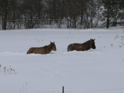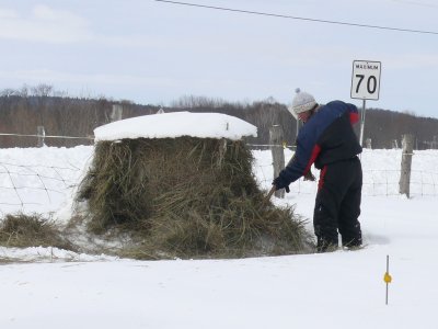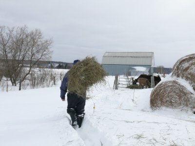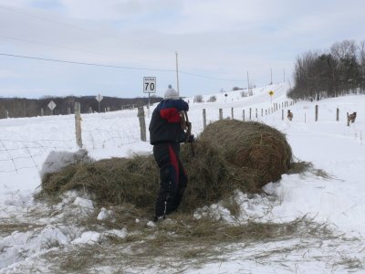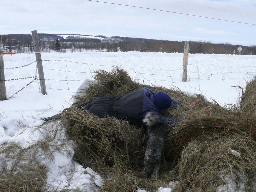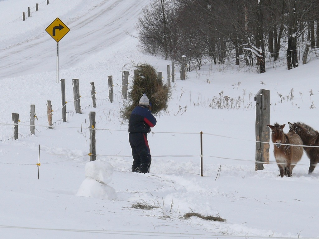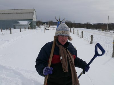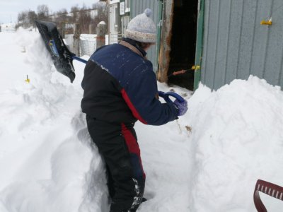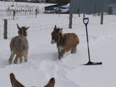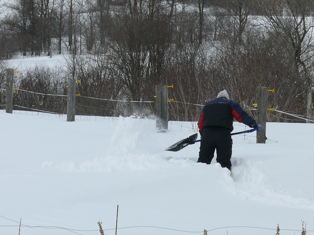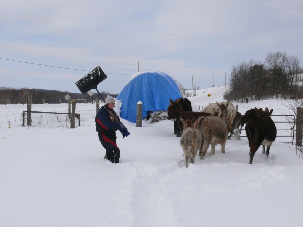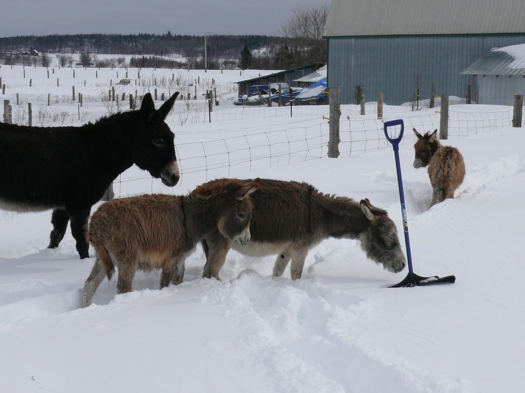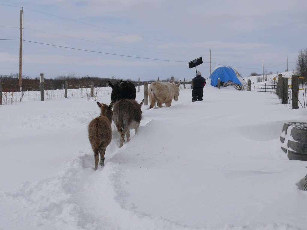 Une fois la grange dégagée, il faut faire un chemin pour les ânes, la neige est trop haute pour eux.