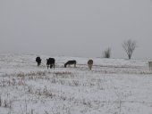 La vie des ânes du Val à l’âne en hiver. Ils mangent du foin paisiblement alors qu’il tombe une petite neige.